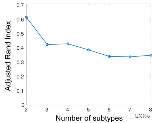 在標(biāo)準(zhǔn)病例對照比較中,患者人群大腦容量既呈現(xiàn)減少的趨勢又呈現(xiàn)增加的趨勢(圖2),但尚不清楚這些影響是由整個患病人群還是由部分患者亞群造成的。HYDRA有效地解決了這個問題,如下所述。研究人員將HYDRA應(yīng)用于感興趣區(qū)域的結(jié)構(gòu)像數(shù)據(jù)上(見補(bǔ)充材料表1),以識別亞型。他們使用adjusted Rand指數(shù)(ARI)來評估在不同數(shù)量的聚類堆(2到8個聚類堆)下聚類堆聚類的一致性(也就是聚類結(jié)果的穩(wěn)定性,如果多次運(yùn)行HYDRA算法得出的亞型聚類堆具有較高的相似性,則說明所發(fā)現(xiàn)的亞型具有高度的可重復(fù)性,反映了聚類出來的亞型的有效性),該指數(shù)對聚類堆的數(shù)量(K)相對不敏感。