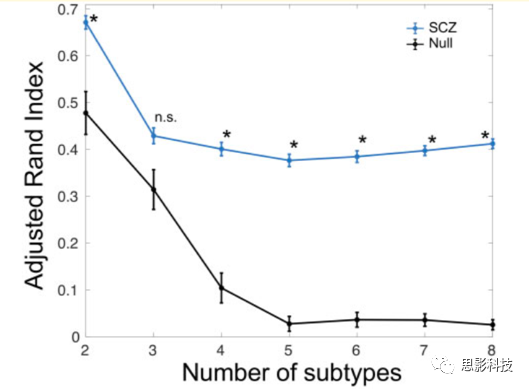 圖4 通過與隨機(jī)排列得到的零分布比較,得到在不同數(shù)量亞型(K)下的ARI的統(tǒng)計顯著性。n.s代表沒有顯著性。
