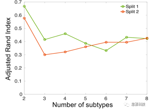 圖5 split-sample測試中的交叉驗證穩(wěn)定性:ARI指標(biāo)與聚類數(shù)量K的關(guān)系,當(dāng)K=2時,在Split 1和Split 2中均呈現(xiàn)最高的可重復(fù)性。