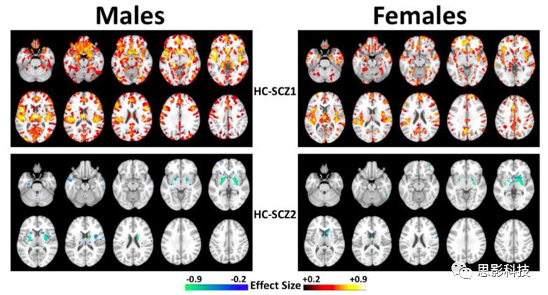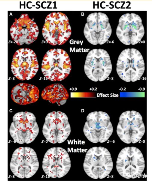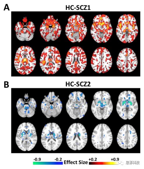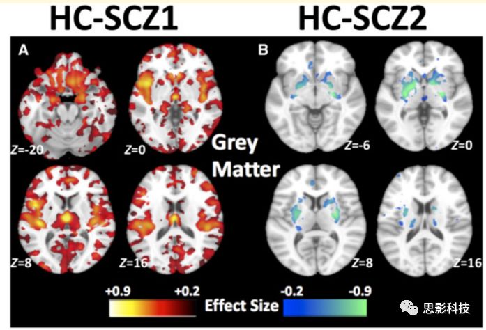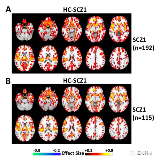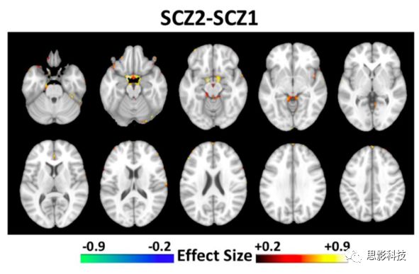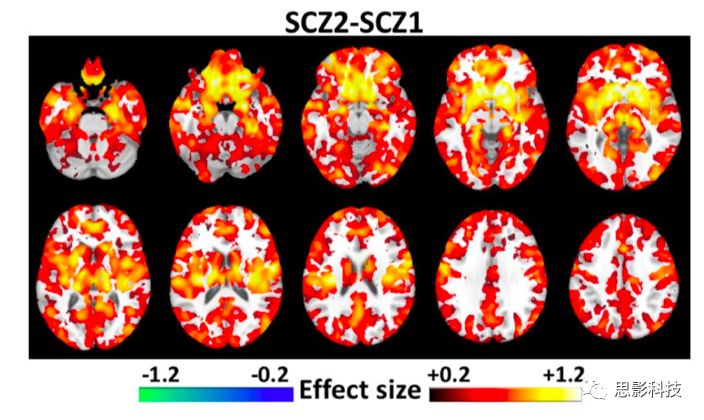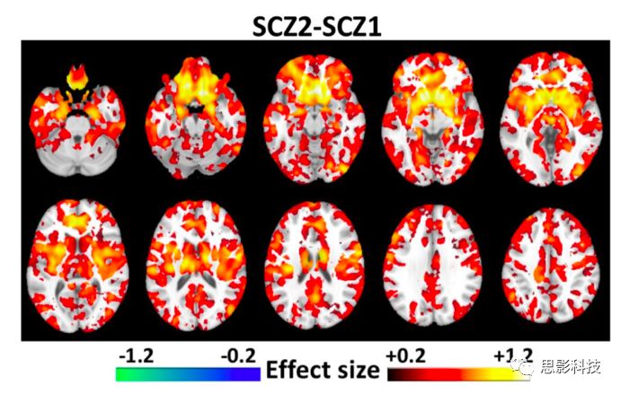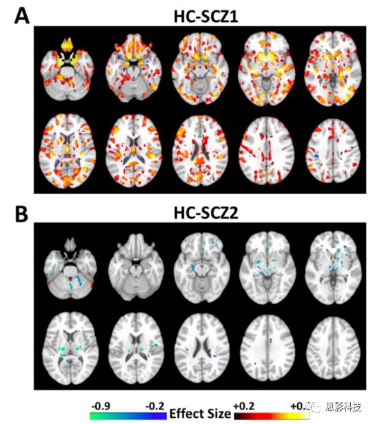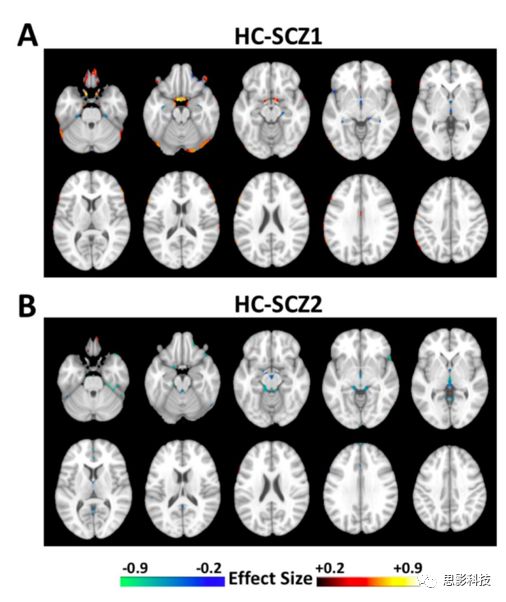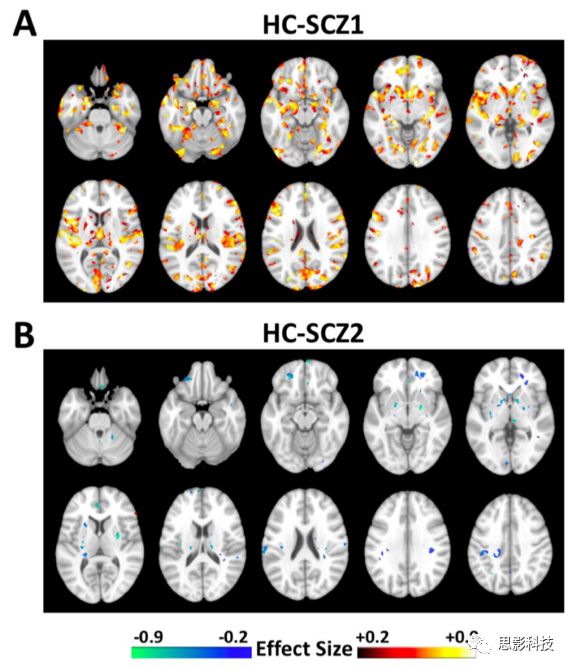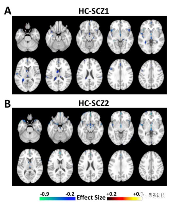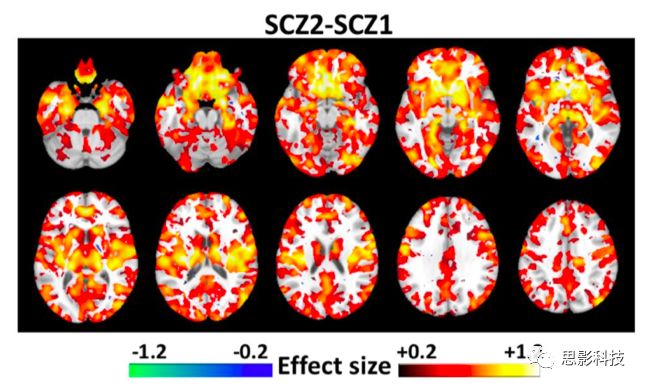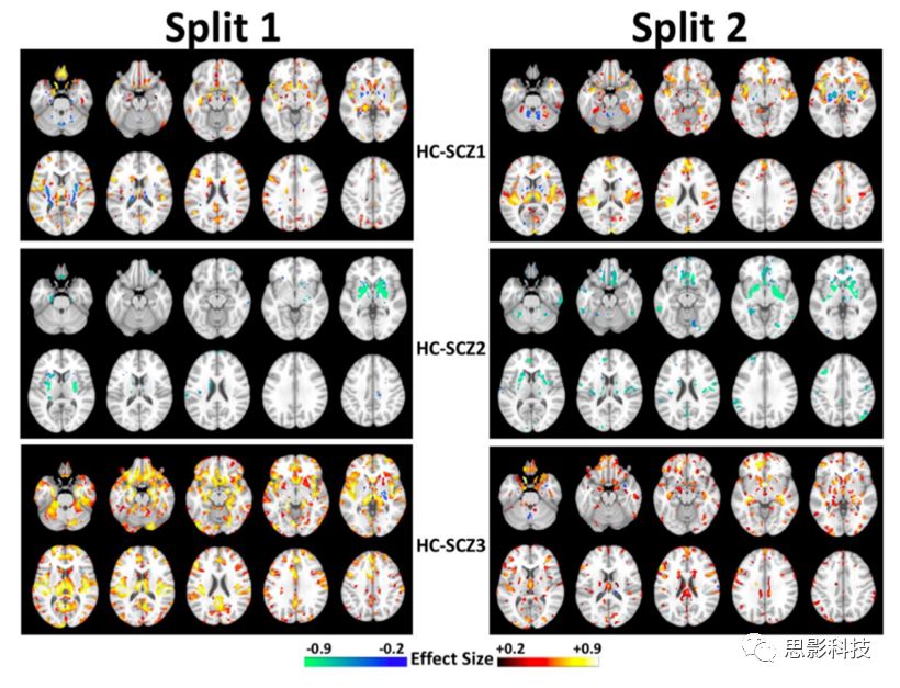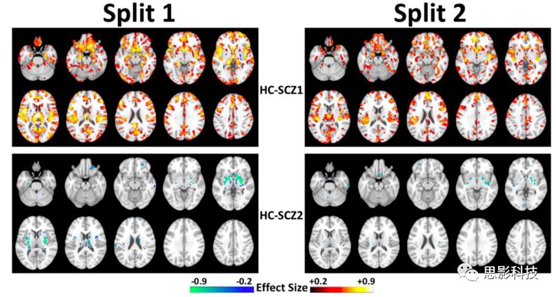 圖6 K = 2時,在兩個Split中,每個亞型(HC-SCZ1與HC-SCZ2)與HC之間的GM體積差異。GM的體積差異模式與使用所有數(shù)據(jù)得到的體積差異模式均相似,FDR-p<0.05。在MIDAS分析中,Effect Size圖是由一組區(qū)域所掩蓋的區(qū)域體積圖(regional volumetric maps)生成的,這些區(qū)域在統(tǒng)計上有顯著差異,之后的所有Effect Size圖都是這樣生成的。