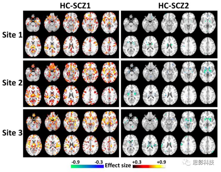 圖8 每個站點(diǎn)中,疾病亞型與健康對照(HC)之間的GM體積差異:與HC相比,SCZ1在丘腦、伏隔核、內(nèi)側(cè)顳葉、內(nèi)側(cè)前額葉/額葉和島葉皮質(zhì)中體積明顯增大,而SCZ2在基底神經(jīng)節(jié)中體積增大,FDR-p<0.05