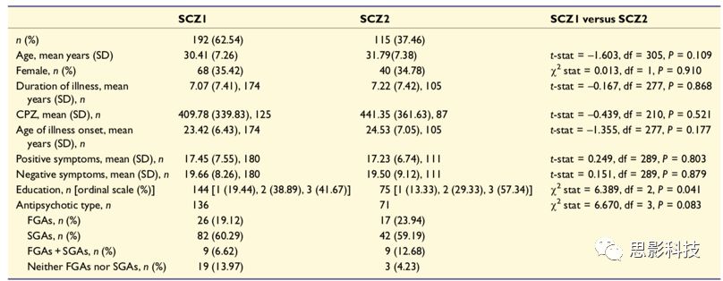 表2 精神分裂癥亞型1和亞型2患者的人口學(xué)和臨床指標(biāo)的比較 FGAs=第一代抗精神病藥;SCZ1 =精神分裂癥亞型1;精神分裂癥亞型2; SGAs=第二代抗精神病藥。