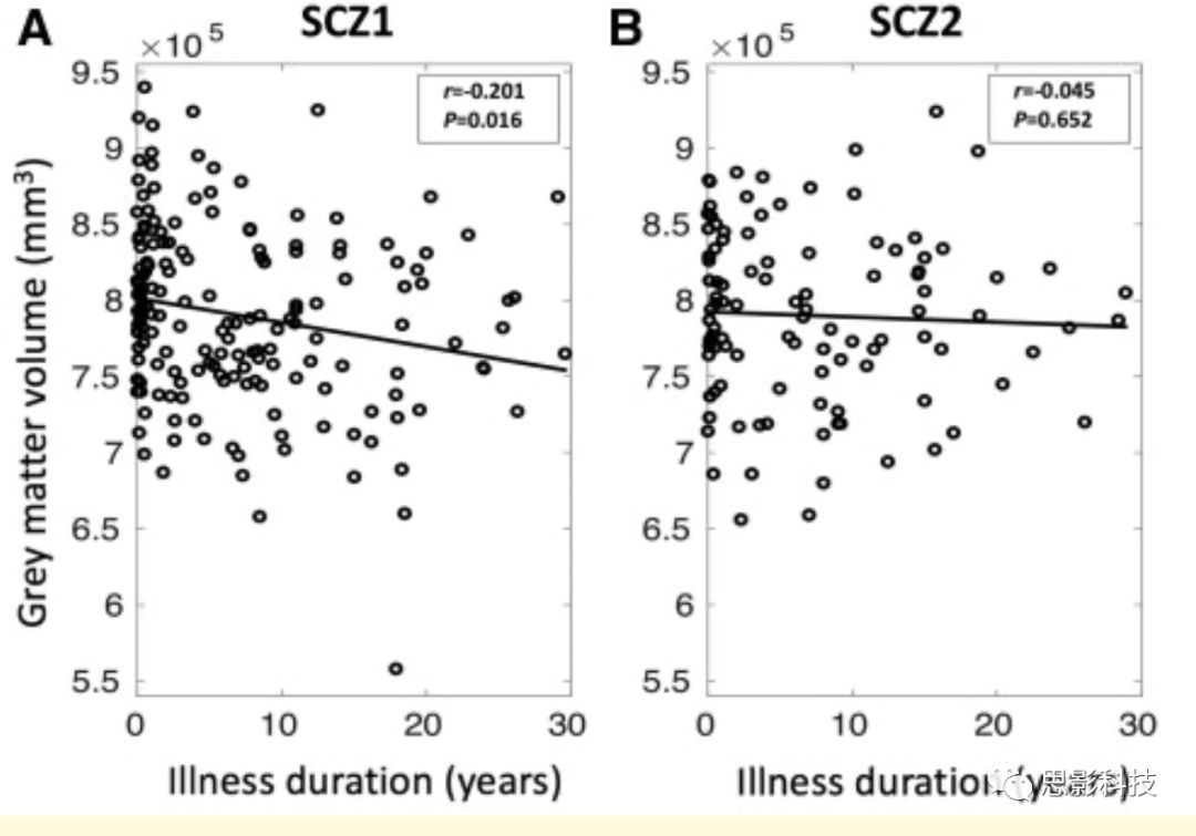 圖22 兩種亞型的總灰質(zhì)體積與病程的關(guān)系。A)精神分裂癥亞型1患者灰質(zhì)體積與病程呈負(fù)相關(guān)(SCZ1;r = -0.201, PFDR = 0.016),但(B)精神分裂癥亞型2的灰質(zhì)體積與病程無顯著相關(guān)性(SCZ2;r = -0.045, P = 0.652)。