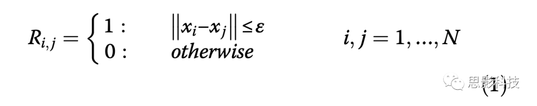 遞歸圖(RP)可以在二維圖中使高維相位空間可視化,可用來(lái)描述系統(tǒng)的基本動(dòng)力學(xué)特征。根據(jù)公式(1),使用每個(gè)樣本對(duì)i和j的時(shí)間序列x以及具體的閾值距離ε(鄰域大?。?,計(jì)算遞歸事件,并儲(chǔ)存在N×N矩陣中(用于構(gòu)建RP)。在坐標(biāo)(i, j)處的RP,當(dāng)遞歸事件(Ri,j = 1)出現(xiàn)時(shí),畫黑點(diǎn);無(wú)事件時(shí)(Ri,j=0)畫白點(diǎn)。