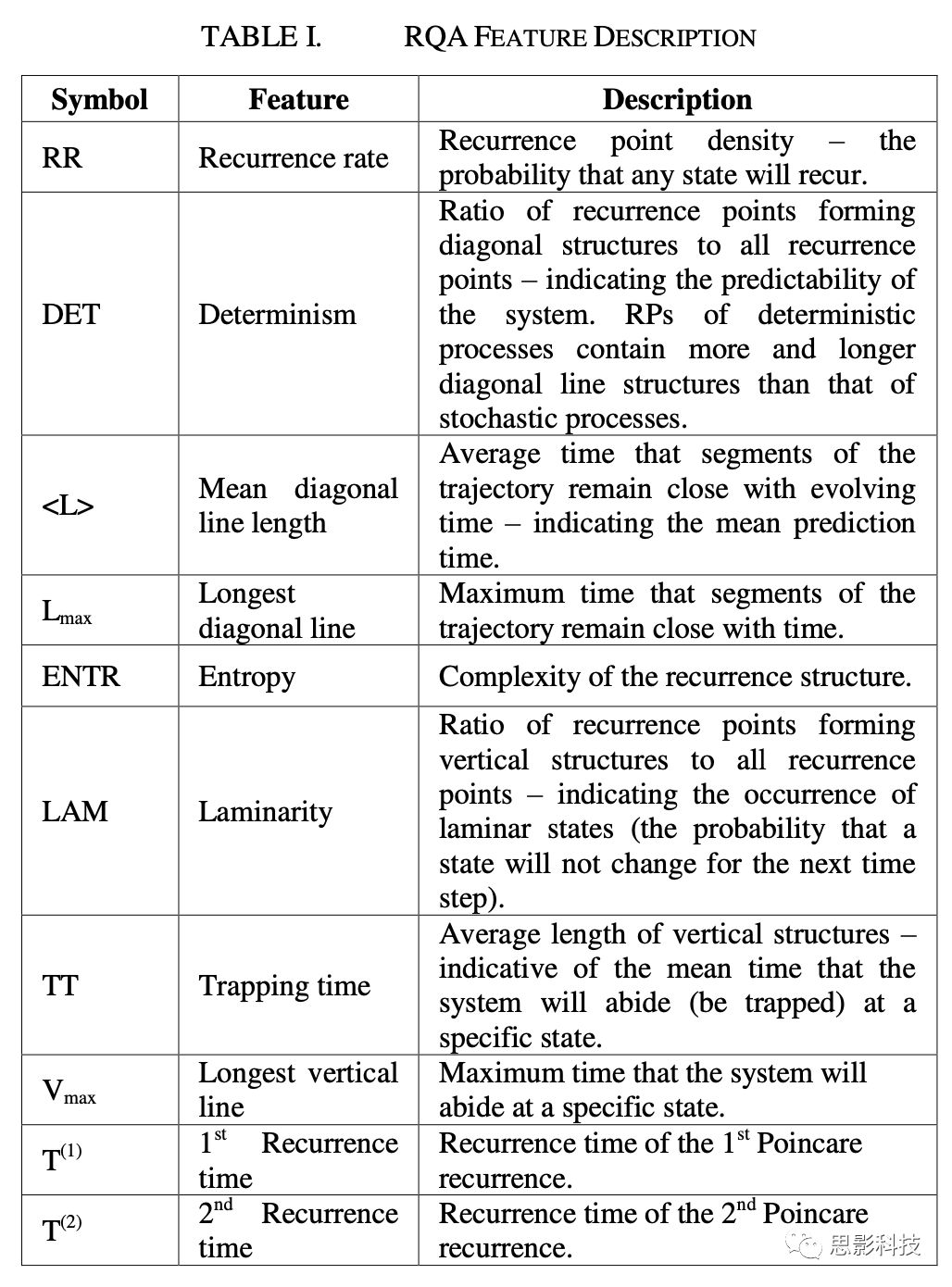 將RQA應(yīng)用于RPs提供了一個(gè)定量系統(tǒng)動(dòng)力學(xué)的客觀測(cè)量。從RPs可以提取幾個(gè)特征,例如:遞歸率(RR;任何狀態(tài)再次出現(xiàn)的概率)、決定論(DET;表明系統(tǒng)的可預(yù)測(cè)性)、熵(ENTR;提供遞歸結(jié)構(gòu)的復(fù)雜性度量)和分層性(LAM;下一步,狀態(tài)不會(huì)改變的概率)。Marwan et al.和Schinkel et al.為RPs和RQA特征提供了進(jìn)一步的數(shù)學(xué)細(xì)節(jié)。