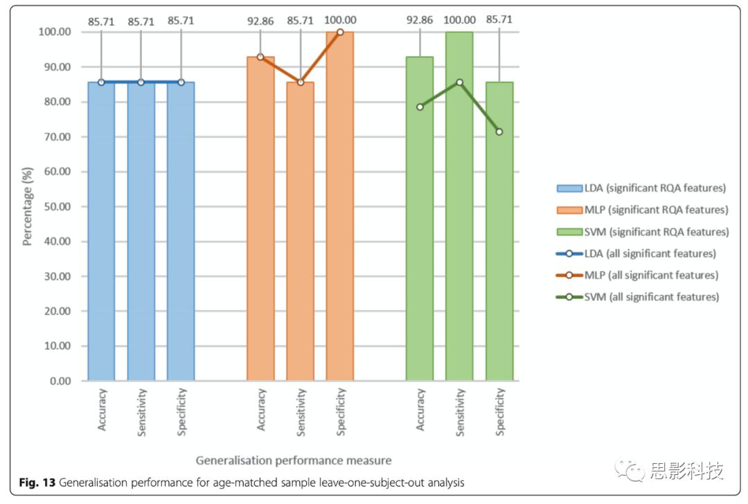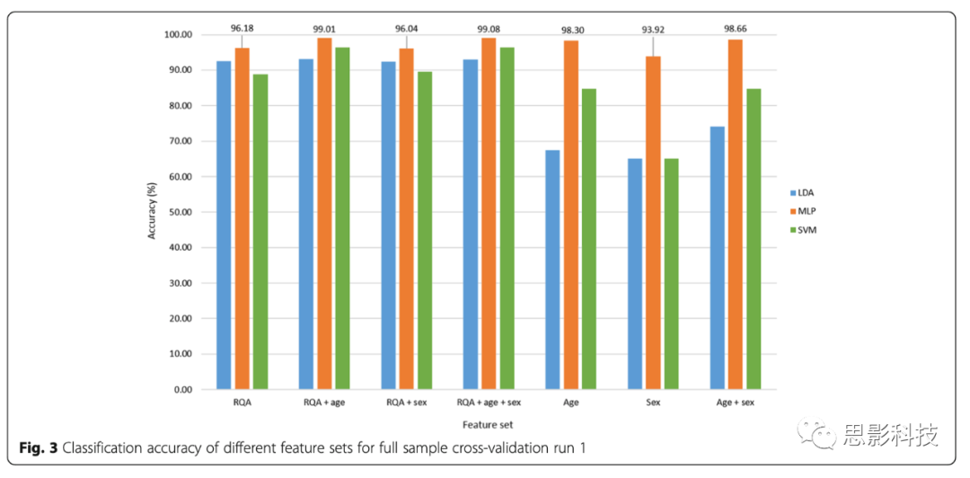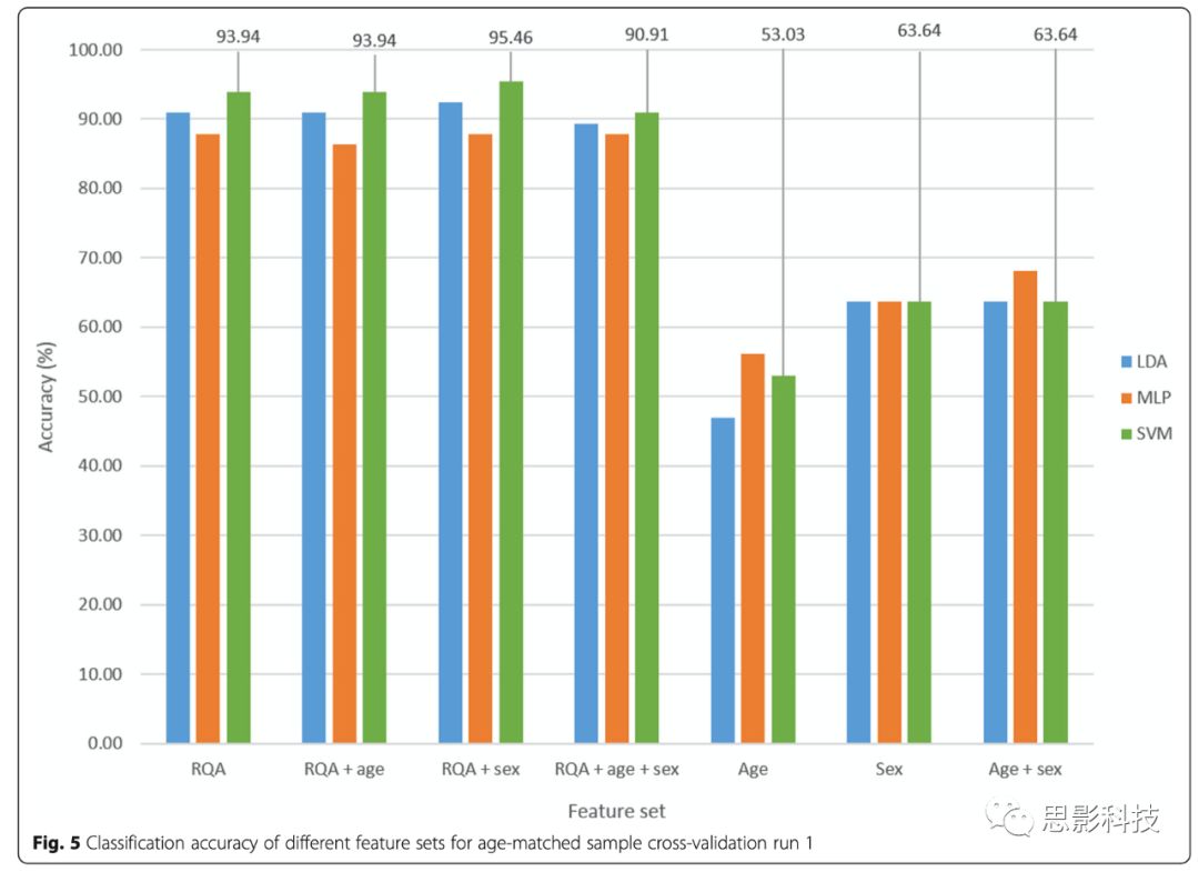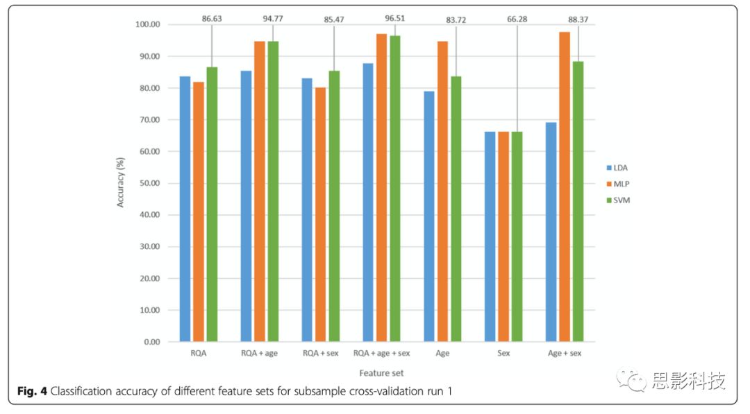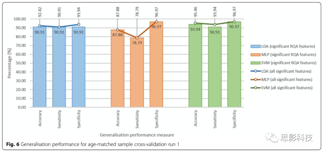 敏感性和特異性測(cè)量都很重要——理想的診斷測(cè)試是100%敏感性和100%特異性。SVM顯示了最好的泛化性能,即可接受的敏感性和特異性。特征集1包含6個(gè)RQA特征,特征集2包含6個(gè)RQA特征以及性別。加上性別,SVM準(zhǔn)確從93.94%增加到95.46%,敏感性從90.91%增加到93.94%,特異性仍為96.97%(Fig. 6)。