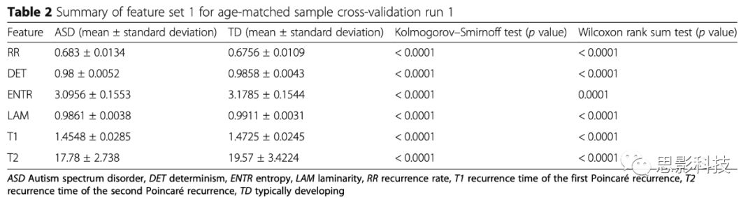 確定的最優(yōu)參數(shù)集:嵌入滯后為25、嵌入維數(shù)為10、PVR為30.09(相當(dāng)于10個(gè)PCs)、鄰域大小為2.9。這一鄰域大小約占所有交叉驗(yàn)證runs的平均最大相位空間大?。?/span>43.13)的6.7%。每次交叉驗(yàn)證run時(shí),都會(huì)對(duì)訓(xùn)練和測(cè)試數(shù)據(jù)進(jìn)行不同的隨機(jī)70/30%拆分,并可能識(shí)別出不同的具有統(tǒng)計(jì)意義的特征集。臨床意義是,一旦為ASD和TD樣本中確定了一個(gè)穩(wěn)健范圍,根據(jù)新提取的RQA特征下降的范圍,未知被試就可以被“診斷”為“有ASD的風(fēng)險(xiǎn)”或“TD”(Table 2)。