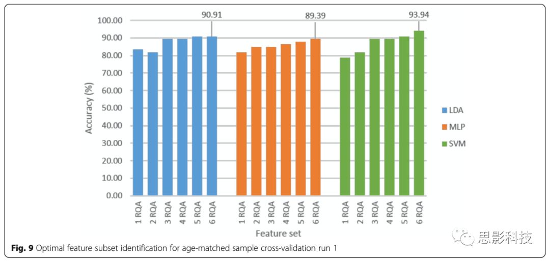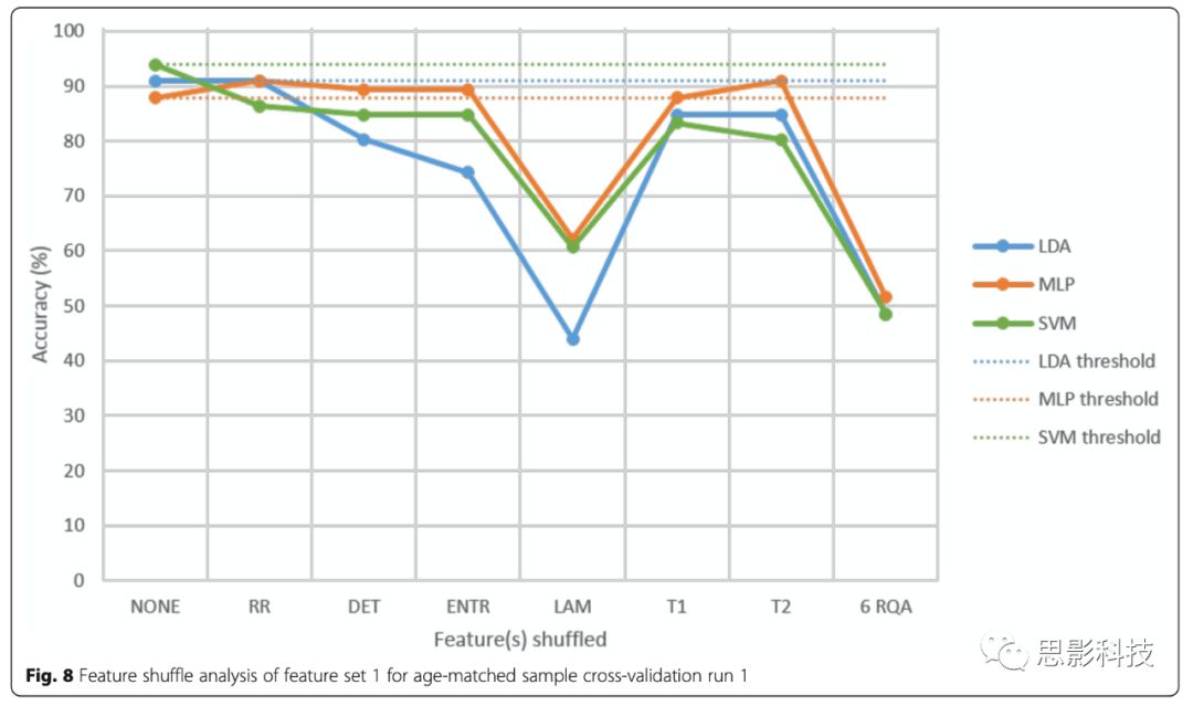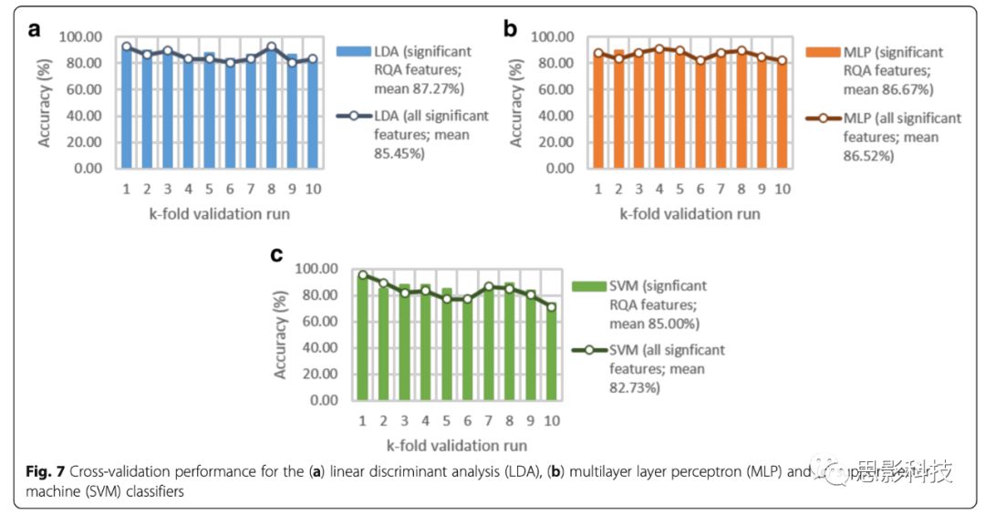 10折的交叉驗(yàn)證結(jié)果(Fig. 7)顯示特征1(顯著的RQA特征)的分類優(yōu)于特征2(所有顯著的特征,RQA和人口學(xué))的分類。特征1的分類準(zhǔn)確率分別為:87.27%(LDA)、86.67%(MLP)、85%(SVM)。