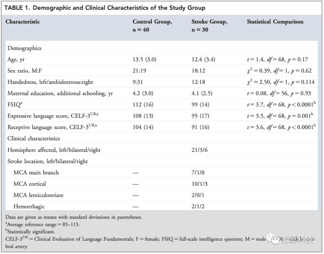本研究招募了30名在新生兒期經(jīng)MRI確診為缺血性/出血性中風(fēng)的英語(yǔ)母語(yǔ)青年(年齡= 7-18歲)組成實(shí)驗(yàn)組。這些被試是從一群有神經(jīng)癥狀的嬰兒中挑選出來(lái)的,他們出生在倫敦的哈默史密斯醫(yī)院,或被轉(zhuǎn)診到這家醫(yī)院。所有患者均接受了早期MRI檢查,并定期隨訪。另外還招募了同一時(shí)期出生的在各方面對(duì)應(yīng)匹配的對(duì)照組(n=40),這一組在年齡(6 - 18歲)、性別和母親教育程度上與實(shí)驗(yàn)組相匹配(人口學(xué)信息見(jiàn)表1)。