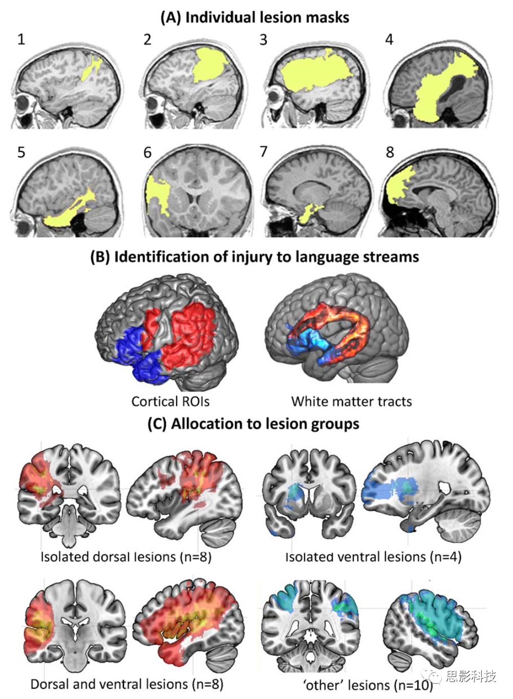 左半球病變患者按病變部位分為三組:1、背側(cè)病變;2、腹側(cè)病變;3、背、腹聯(lián)合病變。第四組為其他病變組,包括右半球損傷。以神經(jīng)放射學(xué)回顧和灰質(zhì)損傷定量分析為指導(dǎo)。使用基于腦脊髓炎診斷的腦脊髓束造影方法來(lái)確定語(yǔ)言損傷的程度。