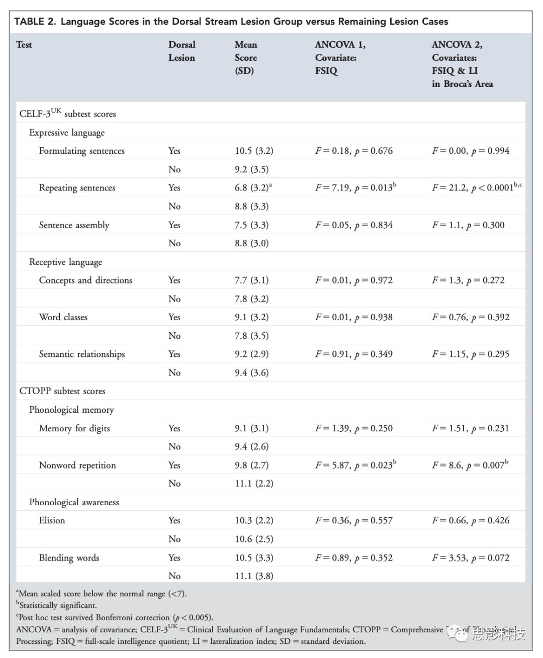 為了探索在語(yǔ)言重復(fù)方面的個(gè)體差異是否可以由語(yǔ)言的腦偏側(cè)化的變化來(lái)解釋,作者對(duì)Broca’s區(qū)域的fMRI激活的側(cè)化指數(shù)進(jìn)行了統(tǒng)計(jì)(偏側(cè)化指數(shù)比較簡(jiǎn)單,就是左側(cè)平均激活值減去右側(cè)平均激活值除以兩側(cè)平均激活值),然后將其加入了上述的協(xié)方差分析的協(xié)變量矩陣中;結(jié)果發(fā)現(xiàn),背側(cè)病變組的語(yǔ)音重復(fù)效應(yīng)仍然顯著(p<0.0001)(見(jiàn)表2)。有趣的是,發(fā)現(xiàn)腹側(cè)病變組在理解口頭指令方面存在缺陷(CELF-3UK的概念和方向子測(cè)試,p=0.002)。將病變體積加入?yún)f(xié)變量不改變以上的統(tǒng)計(jì)發(fā)現(xiàn)。