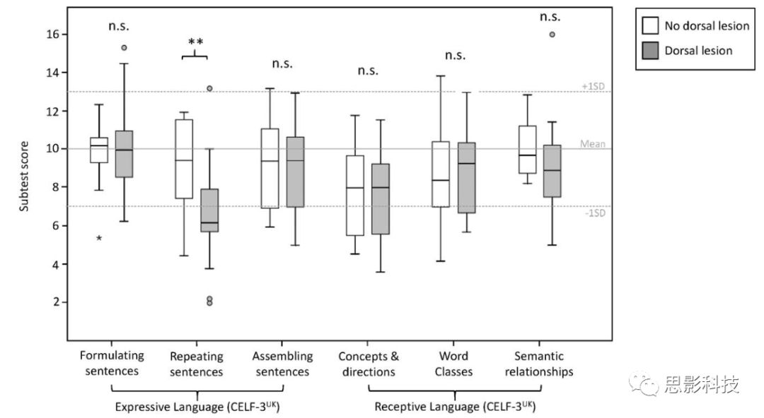 這種效應(yīng)在腹側(cè)流損傷中沒(méi)有觀察到(p>0.154)。所有病變組在重復(fù)數(shù)字串、表達(dá)/接受性語(yǔ)言總分、接受性語(yǔ)法、語(yǔ)音意識(shí)或讀寫(xiě)能力方面無(wú)差異(p>0.245)。腹側(cè)和背側(cè)合并病變組的句子重復(fù)評(píng)分與對(duì)照組無(wú)差異(p=0.465)。