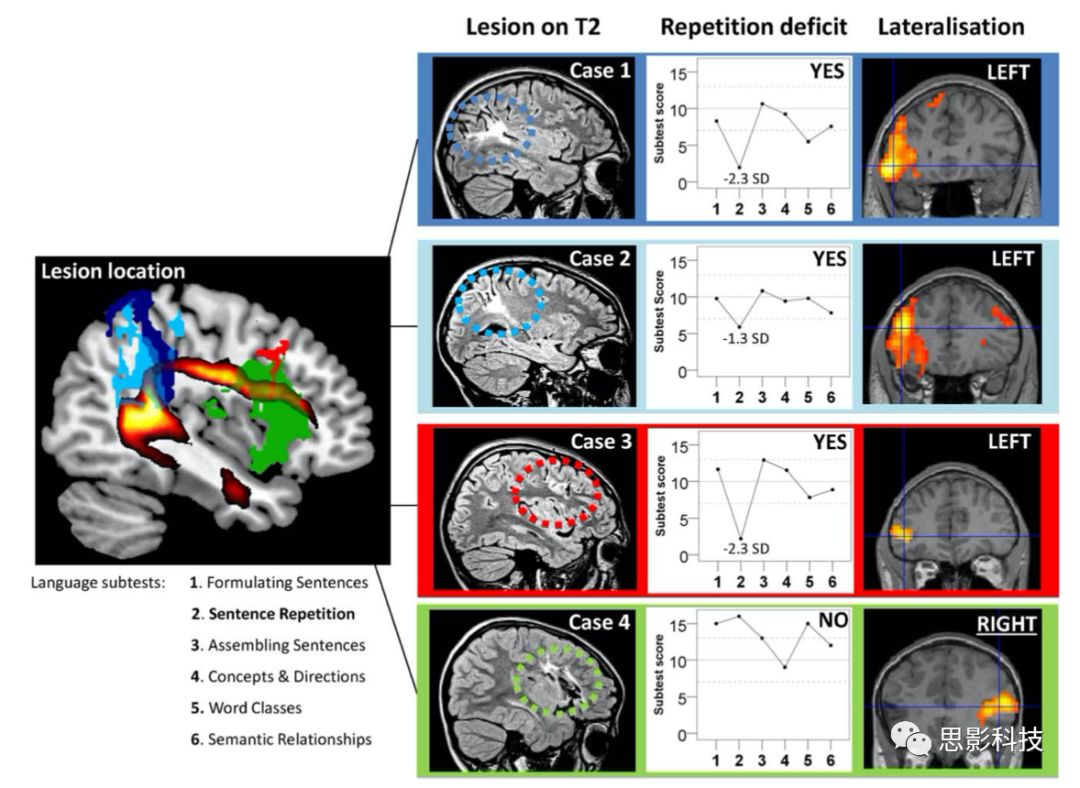 圖3 受損部分和不同語(yǔ)言技能得分的個(gè)案表型注釋:上圖中展示了4個(gè)存在背側(cè)通路損傷的被試的病灶、語(yǔ)言得分和激活偏側(cè)化情況,可以發(fā)現(xiàn)case 4的重復(fù)能力較好,雖然病灶位置和重復(fù)能力特差的case3相似,但其是右偏激活,但前三個(gè)被試都是左偏激活,重復(fù)能力表現(xiàn)很差,都比平均語(yǔ)言得分大于一個(gè)標(biāo)準(zhǔn)差以上。雖然是個(gè)案分析,但已經(jīng)能說(shuō)明一定問(wèn)題,后面有相關(guān)分析的的量化分析的證據(jù)。