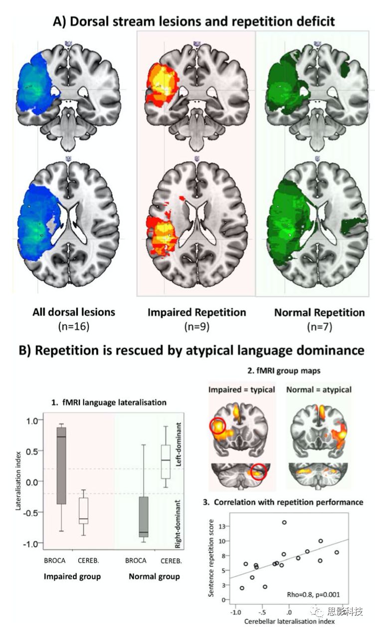 與未受損組相比,言語(yǔ)重復(fù)受損組在Broca s區(qū)域的激活(左偏)值更高,而未受損組在語(yǔ)言任務(wù)中更容易激活右半球,即右半球相對(duì)激活更高(Mann Whitney: p=0.005)。所有患者的小腦功能磁共振成像(Mann Whitney: p<0.001)證實(shí)了這一點(diǎn),所有患者的小腦功能磁共振成像在結(jié)構(gòu)上是完整的,相對(duì)于額葉,顯示出更可靠的交叉?zhèn)然?b>研究發(fā)現(xiàn),小腦偏側(cè)化(rho=0.80, p=0.001)與背側(cè)受損的被試保留重復(fù)功能顯著相關(guān)(見(jiàn)圖4)。