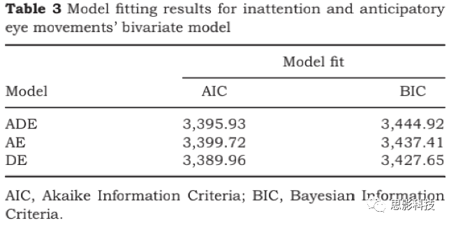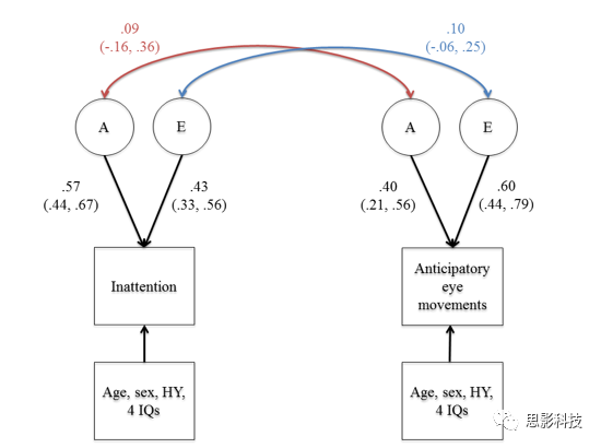 未經(jīng)調(diào)整的AE模型(圖1)評(píng)估表明,注意力不集中的遺傳率較高(h2=0.70;95%CI:0.60,0.79),預(yù)期性眼動(dòng)遺傳率中等(h2=0.49;95%CI:0.35,0.62)。雙變量模型確定了注意力不集中與預(yù)期眼動(dòng)比例之間中等大小的遺傳相關(guān)性,但精確度相對(duì)較低(r=0.19;95%CI:0.02,0.36)。