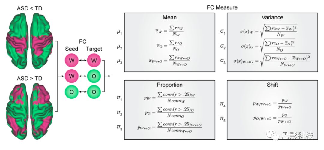 作者通過這樣的方法避免了使用不同分區(qū)大小template帶來的構造網絡維度不一致的問題,通過無偏的方法對ASD和TD(典型發(fā)展人群)的功能連接進行比較。在構建過程中,只有正相關被包括在內。這樣做,一方面避免可能由全局信號引起的虛假負相關(在數據分析過程中,由于配準和平滑的影響,體素的時間序列信號可能受到這些全腦操作的影響從而產生anti-correlation,這就是為什么在18年-19年有段時間很多人爭議rsfMRI的預處理要不要做去全腦信號這一步),另一方面,負相關是不符合rsfMRI的成像原理的,其生理機制難以解釋。在所有進一步的組比較和相關分析中,作者控制了被試的背景,性別,年齡和智商影響。