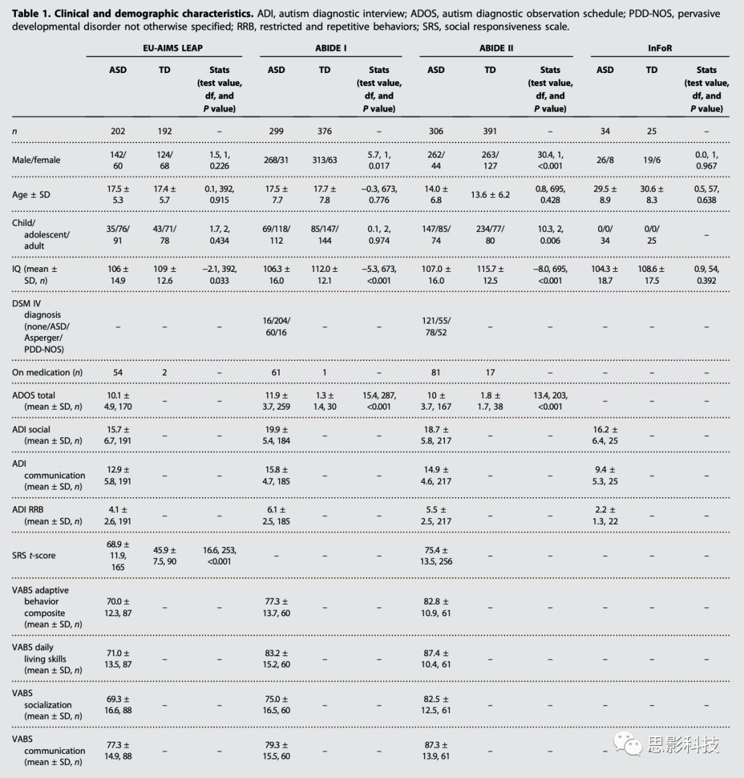 四個ASD數據集(EU-AIMS LEAP,ABIDE I,ABIDE II和InFoR)以及與之匹配的正常對照組(TD)被納入研究(表1)。多中心EU-AIMS LEAP和單一中心InFoR數據庫提供了標準的數據采集流程和臨床特征量表得分數據。AIDE I和II是大型國際腦成像中心提供的回顧性數據的匯總數據集。數據分析了排除智商低于閾值的被試,并消除不良的圖像質量數據,最后,EU-AIMS LEAP,ABIDE I,ABIDE II和InFoR數據集分別有35%,39%,33%和14%的數據量可用 (表1)。