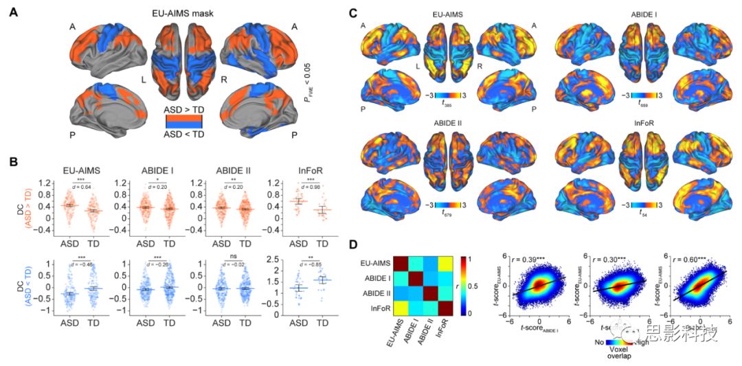 相反,DC下降僅成功地在兩個數據集中得到重復(ABIDE I,P = 0.001; InFoR,P = 0.002)中予以重復(圖1B下)。作者還進一步評估了無閾值DC變化模式的空間相似性,通過基于在ASD和TD比較中為每個數據集獲得的全腦的無閾值化t-圖,計算四個隊列組間差異圖的相似性(1C)。這些分析揭示了ASD所有四個數據集中表現(xiàn)出的與TD組的DC連接差異之間的顯著相關性(所有P <0.001;圖1D)。這說明,無論是在探索性分析基礎上的ROI分析和全腦層面的組間差異圖的voxel重疊分析都有一致的證據表明,ASD患者相對于TD(典型發(fā)展人群)在功能連接上表現(xiàn)的差異(無論是增高還是降低的區(qū)域)是具有跨被試異質性的一致性的,是可以得到重復的。