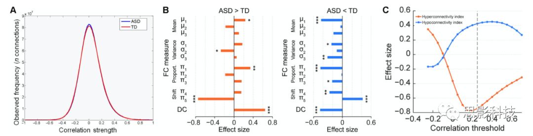 在確定ASD患者可重復的DC改變后,作者探討了這些連接差異的性質。首先比較了在ASD與TD被試中觀察到的全腦體素功能連接強度值的分布,發(fā)現(xiàn)兩組被試在體素層面的功能連接的分布相似(圖2A)。