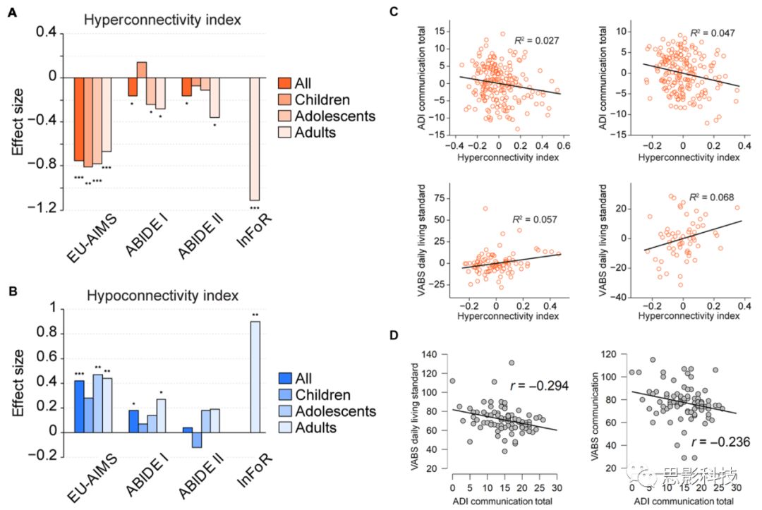 (C)EU-AIMS LEAP和ABIDE I數據集中的超連通性指數與ASD臨床量表的相關性(針對年齡,性別,背景,和智商進行了協(xié)變量回歸)。