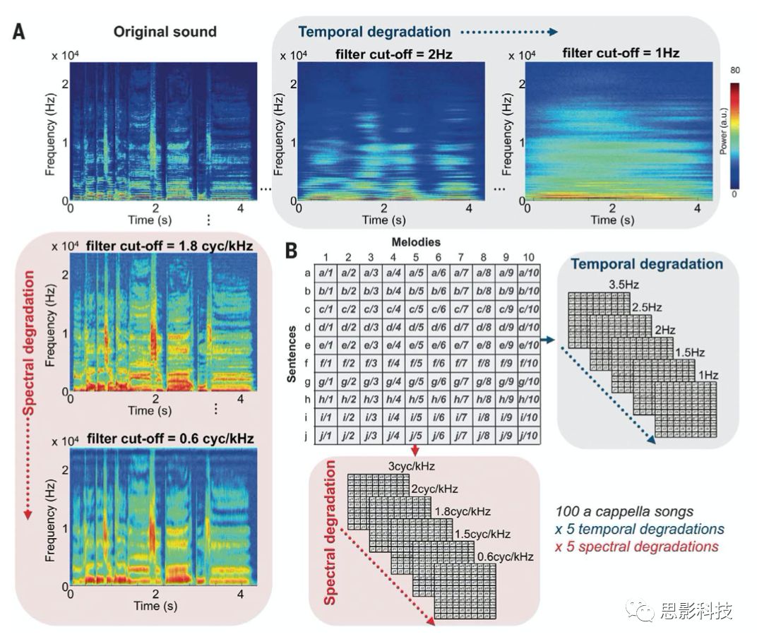 首先在一個(gè)行為實(shí)驗(yàn)中調(diào)查了STM rate對(duì)句子或旋律識(shí)別分?jǐn)?shù)的重要性。以法語為母語的人(n = 27)和以英語為母語的人(n = 22)被出示成對(duì)的刺激物,并被要求辨別講話內(nèi)容或旋律內(nèi)容。因此,兩項(xiàng)任務(wù)設(shè)置的刺激是相同的,只有被試受到的任務(wù)說明的差異(即使用相同的聲音材料,但判斷不同的任務(wù))。如圖1所示,為了能夠達(dá)到對(duì)材料在時(shí)域和頻譜上的degradation,作者對(duì)由10句話和10句歌詞混合成的100首自然歌曲分別在時(shí)域上做了5次高通濾波(分別是3.5H、2.5Hz、2Hz、1.5Hz和1Hz),在頻譜密度進(jìn)行了5次截止值分別為3、2、1.8、1.5和0.6cyc/kHz的濾波。通過這樣的方法,一共產(chǎn)生了1000個(gè)刺激材料。