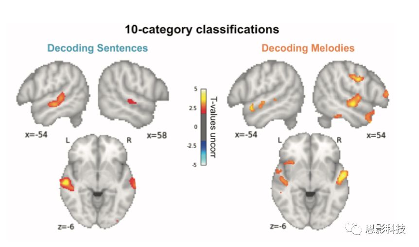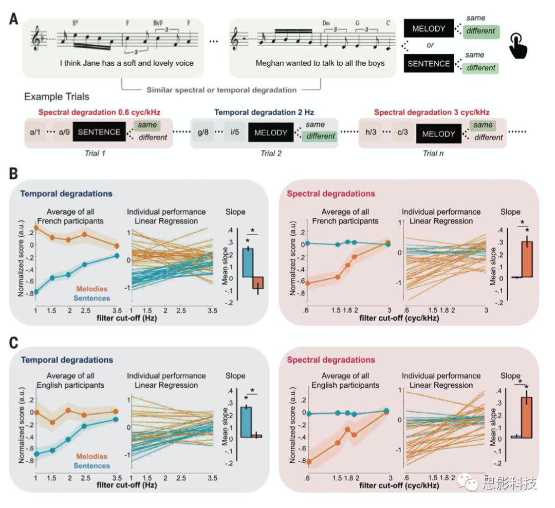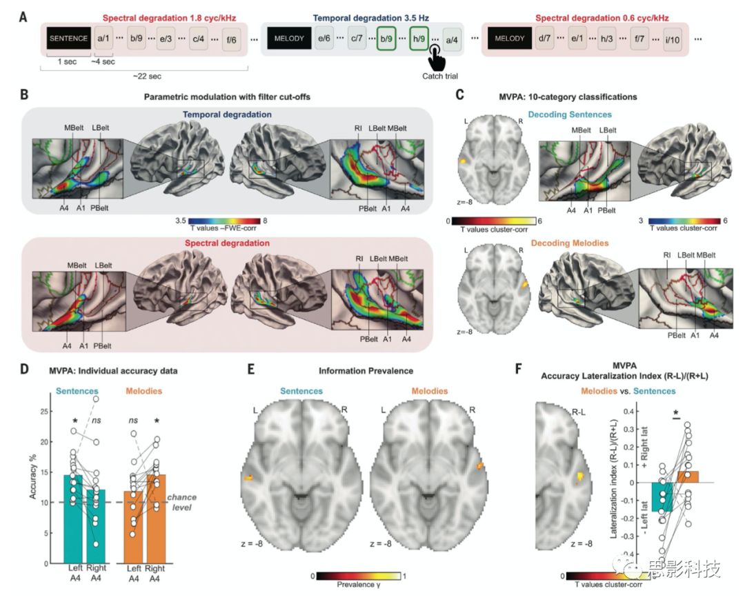 來自加拿大蒙特利爾實(shí)驗(yàn)室的研究者對(duì)這一問題進(jìn)行了研究,成果發(fā)表在Science雜志上。本文通過有選擇地過濾時(shí)間或頻譜調(diào)制的歌唱語音刺激(語音刺激中的口語和旋律內(nèi)容是交叉平衡的,是由無樂器旋律和句子語音合成的)。結(jié)果發(fā)現(xiàn),語音感知只隨著時(shí)間信息的調(diào)制而下降,而旋律感知只隨著頻譜信息的調(diào)制而下降。功能性磁共振成像數(shù)據(jù)顯示,語音和旋律的神經(jīng)解碼分別依賴于左右聽覺區(qū)域的活動(dòng)模式。這種不對(duì)稱性是由每個(gè)區(qū)域?qū)︻l譜-時(shí)間調(diào)制速率的特定靈敏度所支持的。最后,信息減少對(duì)感知的影響與它們對(duì)神經(jīng)分類的影響是平行的。本文研究結(jié)果表明,語言和音樂混合信號(hào)的聲學(xué)特性與適應(yīng)這一目的神經(jīng)專門化之間存在匹配。