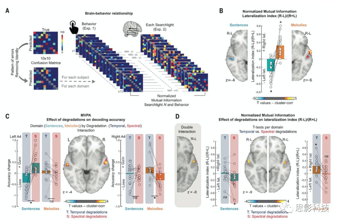 除此以外,作者還在所有trail的基礎(chǔ)上研究了時(shí)域頻率和頻譜的degradation和左右偏側(cè)化的關(guān)系。使用了和我們上文中描述的一樣的NMI方法,構(gòu)建出了行為數(shù)據(jù)對(duì)不同類型(句子和旋律)degradation的混淆矩陣和神經(jīng)影像數(shù)據(jù)的混淆矩陣,然后計(jì)算了NMI,并使用相同的偏側(cè)化計(jì)算方法,計(jì)算了degradation對(duì)行為數(shù)據(jù)和神經(jīng)影像數(shù)據(jù)之間的相關(guān)關(guān)系的影響。發(fā)現(xiàn),對(duì)于句子,NMI在頻譜degradation時(shí)是偏側(cè)的(t(14) = 2.32, p = 0.03),而在時(shí)域degradation時(shí),NMI的偏側(cè)性消失了(t(14) = 0.44, p = 0.66)。相比而言,對(duì)于旋律,NMI在時(shí)域degradation時(shí)表現(xiàn)為右側(cè)化(t(14) = 3.46, p = 0.004),而對(duì)于頻譜degradation表現(xiàn)為右側(cè)化(t(14) = 0.24, p = 0.80,圖4D)。這說明,聽覺半球?qū)τ?span>spectrotemporal的加工是有不同的編碼機(jī)制的,并且這種機(jī)制特定于時(shí)間線索和頻譜線索。