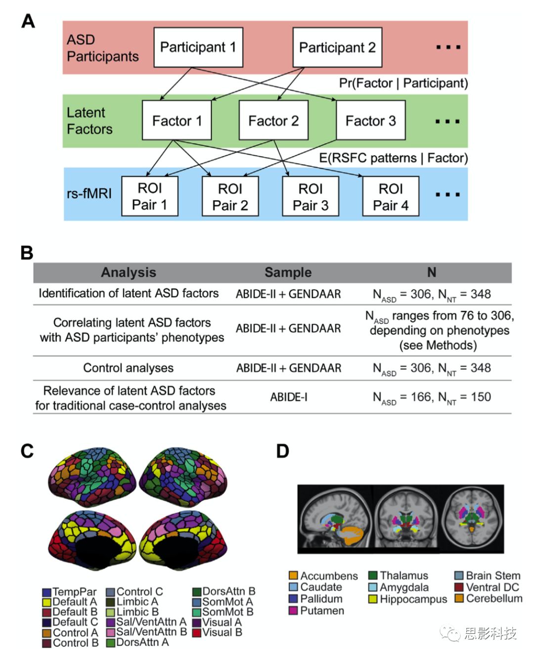 本文的分析分4個步驟進(jìn)行(圖1B)。第一步,確定潛在的ASD因素,作者將貝葉斯模型(圖1A)應(yīng)用于包含ABIDE-II和GENDAAR的組合數(shù)據(jù)集。使用這個組合數(shù)據(jù)集最大化用于MRI及非腦影像表型數(shù)據(jù)的樣本量。第二步,檢查了潛在因素與ASD患者表型之間的關(guān)系(即人口統(tǒng)計(jì)學(xué)或行為癥狀)。第三步,進(jìn)行控制分析以確保結(jié)果的魯棒性。最后,利用了另一個獨(dú)立的數(shù)據(jù)集,ABIDE第一版(ABIDE-I),以探索病例對照分析的缺點(diǎn)——即不能解決ASD的異質(zhì)性。這項(xiàng)工作的代碼可公開獲取。