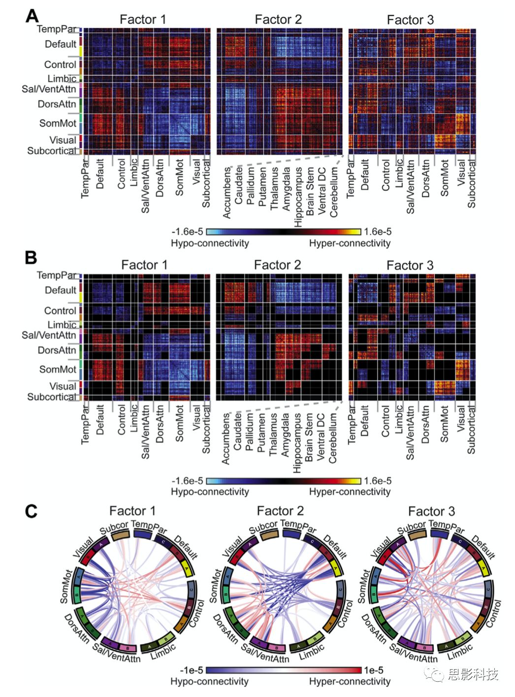 注釋:A為與每個因素相關(guān)的超或低靜息態(tài)功能連接(未閾值化)模式。暖色(紅色)表示超連通性(相對于神經(jīng)典型組即對照組的連通性),冷色(藍(lán)色)表示低連通性(相對于神經(jīng)典型組的連通性)。B為具有統(tǒng)計(jì)學(xué)意義的超/低靜息態(tài)功能連接模式與每個因素相關(guān)。C與每個因素相關(guān)的超/低靜息態(tài)連接的顯著模式,在網(wǎng)絡(luò)內(nèi)部和網(wǎng)絡(luò)之間取平均值。