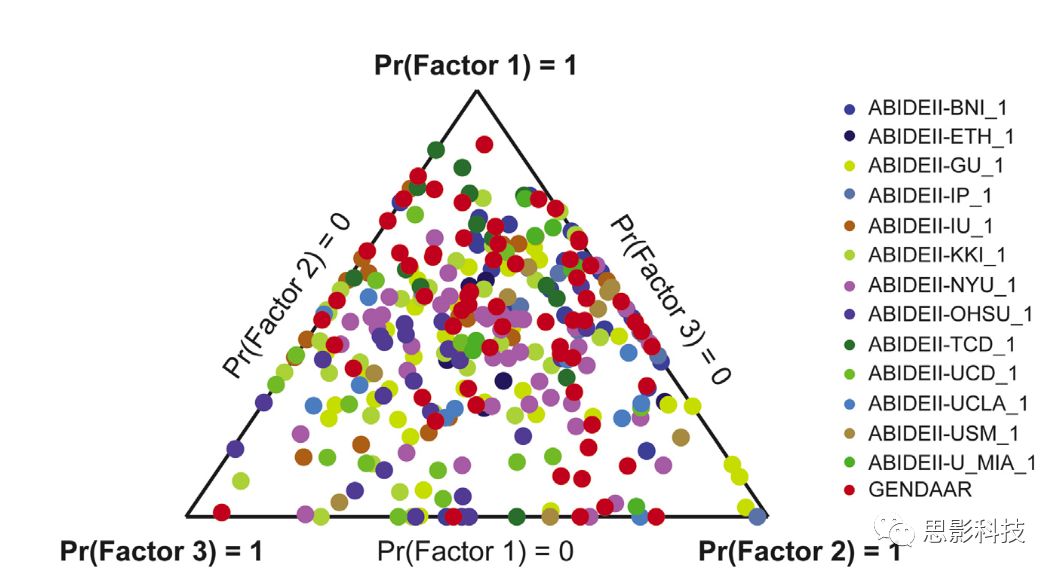 圖3顯示了ABIDE-II+GENDAAR合并數(shù)據(jù)集中自閉癥患者的因素組成。絕大多數(shù)被試呈現(xiàn)多個潛在因素而不是單個因素。沒有單個數(shù)據(jù)點(diǎn)主要顯示單一因素,表明潛在因素不是由站點(diǎn)差異驅(qū)動的。