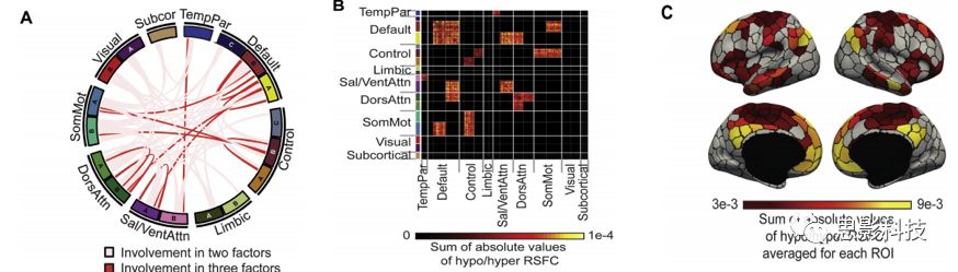 為了檢查各因素之間共享的低連通和超連通RSFC模式,對具有顯著z得分(圖2C)的網(wǎng)絡(luò)內(nèi)和網(wǎng)絡(luò)間模塊進(jìn)行了二值化處理(忽略異常的方向性),并跨三個因素將它們相加(圖4A)。 另外,將在整個過程中顯著的低和超RSFC模式的絕對值相加以獲得(圖2B)跨因素常見的低RSFC和高RSFC模式頻譜(圖4B)。