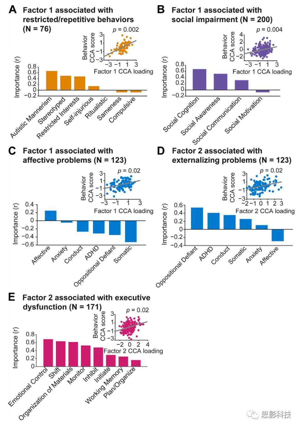 (E)因素2與行為評估量表衡量的功能執(zhí)行功能的相關(guān)。條形圖顯示每個行為之間的皮爾遜相關(guān)性得分和CCA行為負(fù)荷。正相關(guān)表明該因素的較高負(fù)荷與更大的損害相關(guān)。散點(diǎn)圖顯示CCA行為評分之間的關(guān)系負(fù)荷和CCA自閉癥譜系障礙因素的載荷,其中每個點(diǎn)代表被試自閉癥譜系障礙。因素1與不良的限制性和重復(fù)性行為相關(guān),與社交缺陷和情感問題相關(guān),而因素2是與更嚴(yán)重的外部化問題執(zhí)行功能障礙相關(guān)。