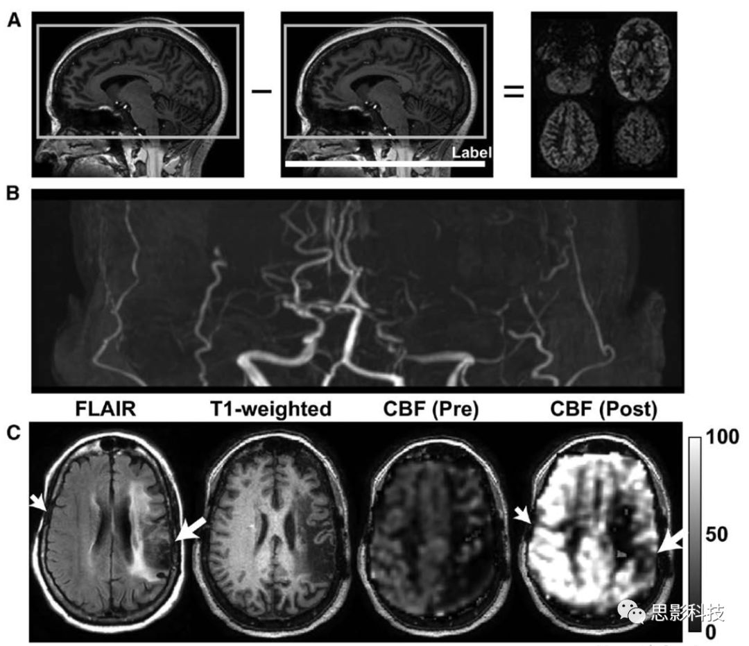 A:在ASL-MRI中,使用單個(gè)(脈沖或連續(xù)的)或一系列(偽連續(xù)的)射頻脈沖對血液進(jìn)行磁性標(biāo)記,之后反轉(zhuǎn)的血液流入成像層面的毛細(xì)血管,與組織液交換,并衰減血管外水信號。通過將該圖像與其中未標(biāo)記血液的圖像進(jìn)行比較,可以獲得灌注加權(quán)圖。B:煙霧病合并左側(cè)頸內(nèi)動(dòng)脈床突上段閉塞、右側(cè)頸內(nèi)動(dòng)脈遠(yuǎn)端局灶性狹窄和雙側(cè)大腦中動(dòng)脈閉塞患者的飛行時(shí)間磁共振血管成像。