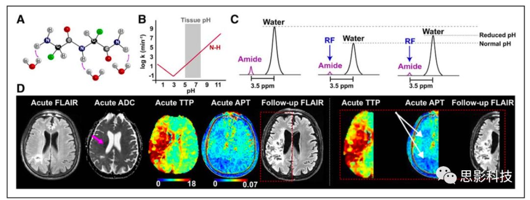 為了進(jìn)一步區(qū)分良性血供減少區(qū)和半暗帶,必須清楚組織的代謝環(huán)境的作用。為了維持跨膜離子梯度,半暗帶區(qū)域組織OEF增加,且為厭氧糖酵解。無氧代謝導(dǎo)致組織酸中毒,因此酸中毒可能是損傷的敏感指標(biāo)。酰胺質(zhì)子與水交換的速率受pH的影響,通過交換相關(guān)的飽和原理,這種影響可以用質(zhì)子磁共振波譜來評估。最近研究表明,酰胺質(zhì)子轉(zhuǎn)移(APT)化學(xué)交換飽和轉(zhuǎn)移MRI是一種對pH敏感的MRI方法(圖2)?;瘜W(xué)信息是通過酰胺質(zhì)子(主要在肽骨架上,體內(nèi)濃度約為70-100mmol)與成像的水質(zhì)子(濃度約為110M)之間的飽和磁化轉(zhuǎn)移而獲得的。且在較寬的生理pH(pH>3)范圍內(nèi),交換率是堿催化的,因此,APT對水信號的影響隨pH降低或組織酸化而減小。