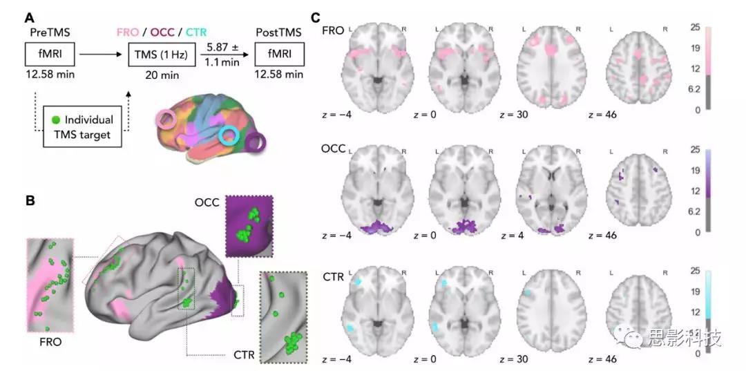 (A)每個被試在3天內(nèi)進行3次TMS-fMRI試驗。每個位點(FRO、OCC、CTR)均接受20min、1Hz的rTMS刺激,分別采集TMS刺激前、后的fMRI數(shù)據(jù)。