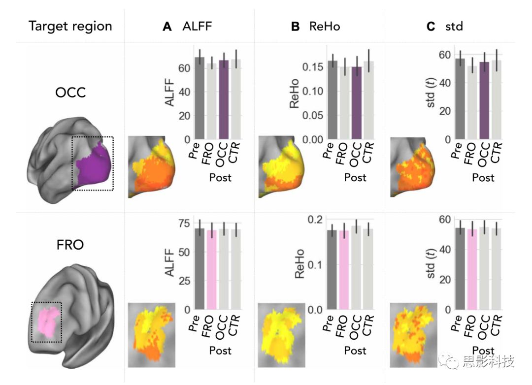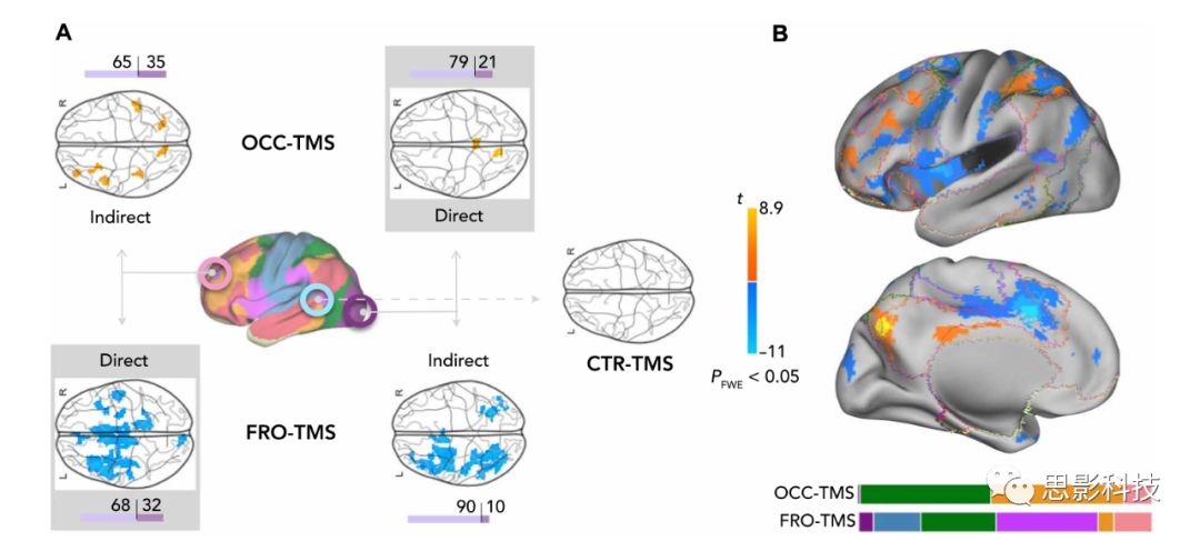 (A)統(tǒng)計圖所示為OCC-TMS, FRO-TMS和CTR-TMS后全腦功能連接顯著變化的區(qū)域。OCC-TMS增強了目標區(qū)域OCC(直接)及非目標區(qū)域FRO的功能連接(間接);相反,FRO-TMS減弱目標區(qū)域FRO及非目標區(qū)域OCC的功能連接;未觀測到CTR-TMS及CTR區(qū)域的功能連接變化。