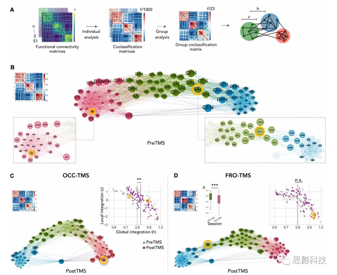 (B)左:群組平均的共分類矩陣,中:preTMS拓撲表征。高共分類值的節(jié)點彼此接近,節(jié)點大小用h表示。節(jié)點顏色表示模塊化從屬關(guān)系。OCC-TMS (C)和FRO-TMS(D)后的群組平均的共分類矩陣、拓撲表征,OCC-TMS增加了OCC及全腦的功能整合。