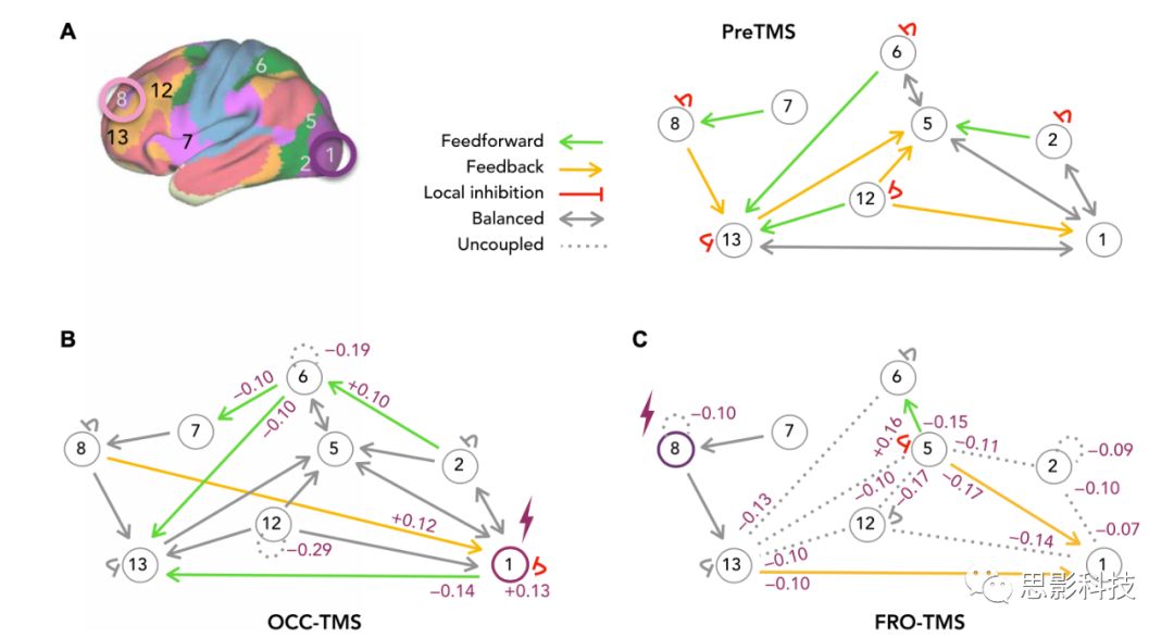 (A)我們使用頻譜DCM對功能連接變化的區(qū)域之間的有向信號進行建模,包含局部抑制信號(紅色)、興奮性前饋信號(綠色)和抑制性反饋信號(黃色)。連接模式說明了沿人類大腦皮層前后(左右)軸的有向信號傳遞。preTMS模型指示特定的前饋、反饋和平衡的(灰色)連接通路。