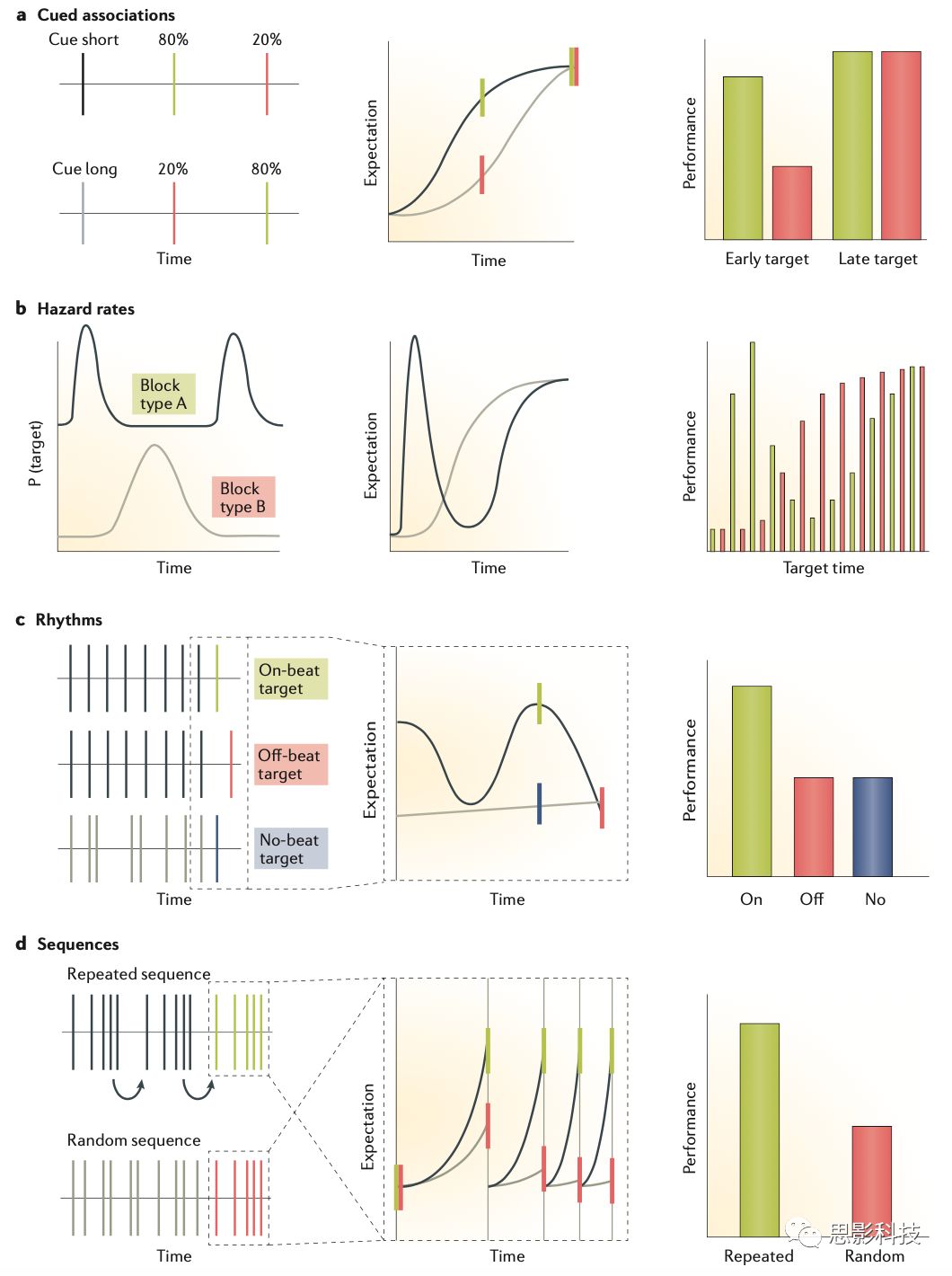 上圖所示為四種能夠指導(dǎo)時(shí)間注意的時(shí)間結(jié)構(gòu):關(guān)聯(lián)(a)、風(fēng)險(xiǎn)率(b)、節(jié)律(c)和序列(d)。左列為任務(wù)結(jié)構(gòu)(豎線表示各個(gè)刺激在其關(guān)聯(lián)的時(shí)間),中間列為期望概況作為時(shí)間的函數(shù)(示意圖),右列為表現(xiàn)概況。在基于風(fēng)險(xiǎn)率的任務(wù)中,通常是從目標(biāo)時(shí)間的特定分布中獲得激勵(lì)。表現(xiàn)概況描述了任務(wù)中行為表現(xiàn)的典型模式(例如感知判斷的速度或準(zhǔn)確率)。