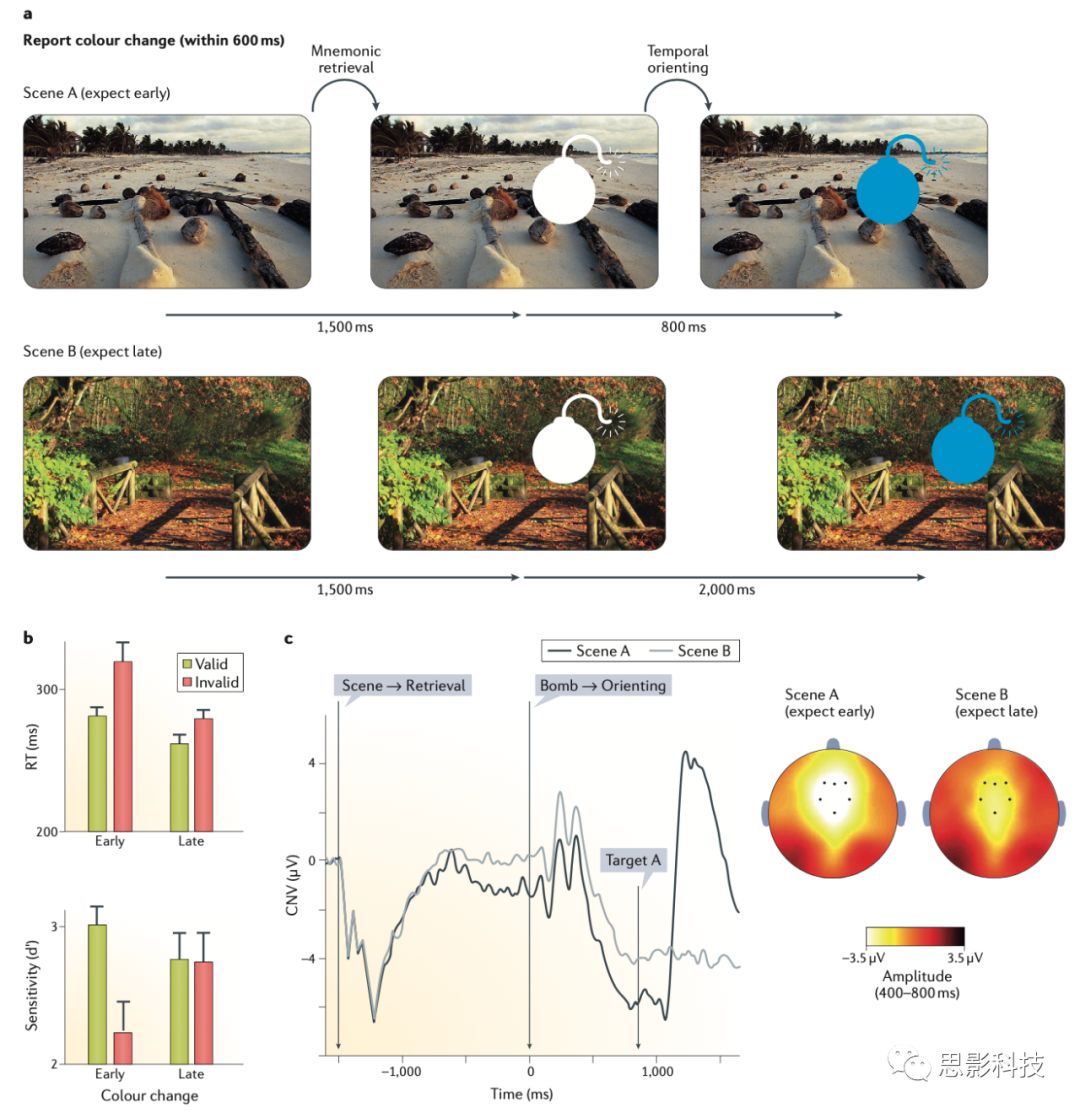 在人類中進(jìn)行的時(shí)間預(yù)期任務(wù)的研究首次提出了預(yù)期的神經(jīng)活動(dòng)的系統(tǒng)性變化,并推測(cè)與“準(zhǔn)備就緒”的增加有關(guān)。預(yù)測(cè)性時(shí)間線索會(huì)極大地放大與預(yù)期和運(yùn)動(dòng)準(zhǔn)備之間的潛在聯(lián)系,稱為伴隨性負(fù)變化(CNV)。 當(dāng)在短時(shí)間間隔內(nèi)預(yù)期目標(biāo)時(shí),與在長(zhǎng)間隔后預(yù)期目標(biāo)時(shí)相比,CNV的發(fā)展要陡得多(圖2c)。