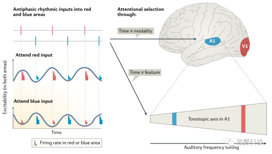 注釋:兩個(gè)有節(jié)奏的輸入以反相的形式呈現(xiàn),分別對(duì)應(yīng)于空間上分離的神經(jīng)元群:初級(jí)聽覺皮層A1(藍(lán)色)處理聽覺輸入(藍(lán)色和紅色區(qū)域分別處理低音和高音輸入),初級(jí)視覺皮層V1(紅色)處理視覺輸入。當(dāng)注意力集中在任何一個(gè)輸入上時(shí),兩個(gè)區(qū)域的顆粒上層中的神經(jīng)元振蕩(1-4 Hz,δ頻帶)都與此對(duì)齊,從而使興奮性增強(qiáng)的時(shí)刻與注意力關(guān)注的輸入相吻合(如左圖所示)在負(fù)責(zé)加工處理注意力關(guān)注的輸入的神經(jīng)元群中,這種調(diào)制相位對(duì)齊會(huì)轉(zhuǎn)化為增強(qiáng)的頻率響應(yīng)(由左下圖中的藍(lán)色和紅色條形表示)。