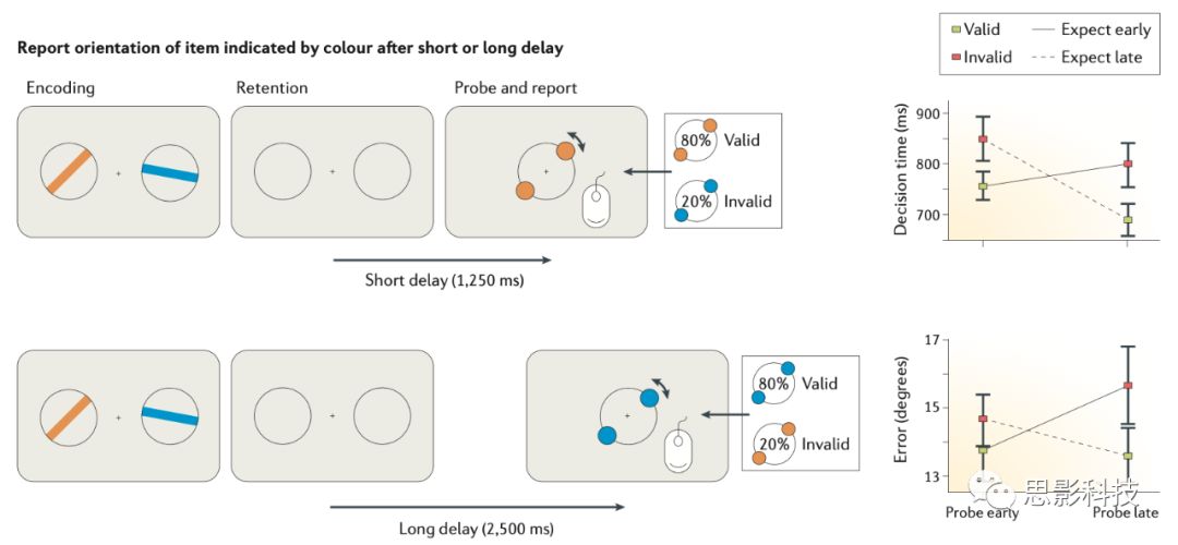 注釋:指示被試記憶兩個(gè)彩條(橘色和藍(lán)色)的方向,在較短(1250 ms)或較長(zhǎng)(2500 ms)延遲后重現(xiàn)其中一個(gè)的方向。被試了解到不同顏色的彩條具有不同的延遲時(shí)間(橘色對(duì)應(yīng)較短延遲,藍(lán)色對(duì)應(yīng)較長(zhǎng)延遲,80%有效),即最有可能探測(cè)到它們。在這兩個(gè)延遲上,當(dāng)探測(cè)到預(yù)期的彩條時(shí),反應(yīng)表現(xiàn)更快、更準(zhǔn)確,這表明了由時(shí)間預(yù)期控制的工作記憶中動(dòng)態(tài)的、特定于項(xiàng)目的優(yōu)先級(jí)。