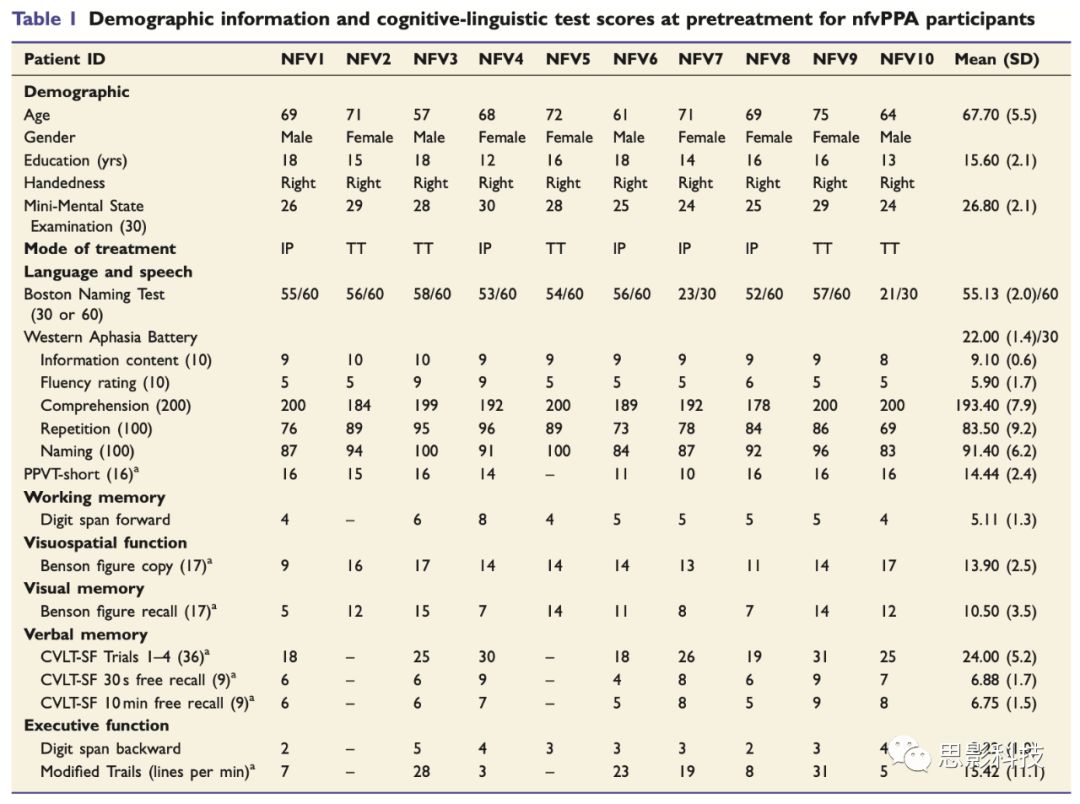 表1 nfvPPA被試治療前的人口統(tǒng)計信息和認知、語言測試分數(shù)