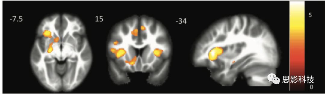 圖1 VBM分析結(jié)果(9名nfvPPA患者和60名健康對照組)