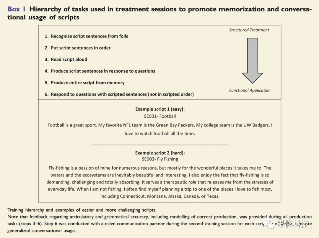 Script training(本文翻譯為程序性訓練,script在中文中常見翻譯為腳本,但這里的意思是取固定的、循環(huán)往復的并且按照一定流程的訓練,因此翻譯為程序性訓練更容易理解)即程序性訓練是一種以獨白或?qū)υ挼男问椒磸途毩暥陶Z或句子材料的技巧,已被證明可以提高失語癥患者以及由中風引起的語言失用癥的語言表達能力和流利度,,因此是nfvPPA行為康復訓練的一種可行的候選方法。作者認為,程序性訓練可能是一種理想的干預手段,因為它有潛力解決nfvPPA的核心運動障礙(失用癥)和語言障礙(失語癥)。