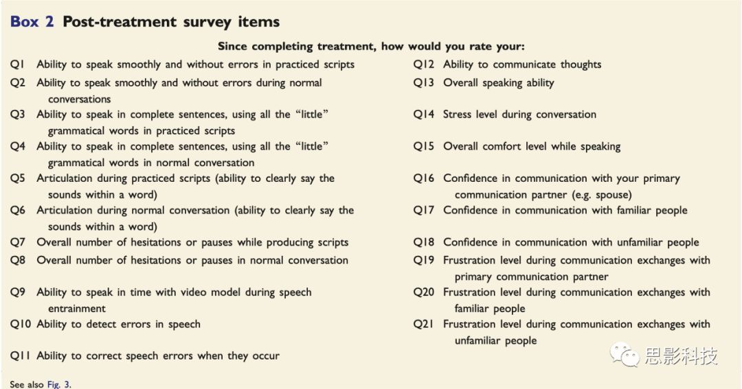 在家庭練習中,被試被要求與錄像中的揚聲器(使用iPad和耳機)實時保持一致,每天至少用當前的程序練習30分鐘。此外,被試還練習了如何清晰地說出一份由2到4個程序的單詞組成的清單,這些單詞在之前與臨床醫(yī)生交流時很難清晰地說出。10名被試中有5人接受了遠程治療,因為他們住在遠離研究地點的地方,使得每次治療都無法在實地進行。