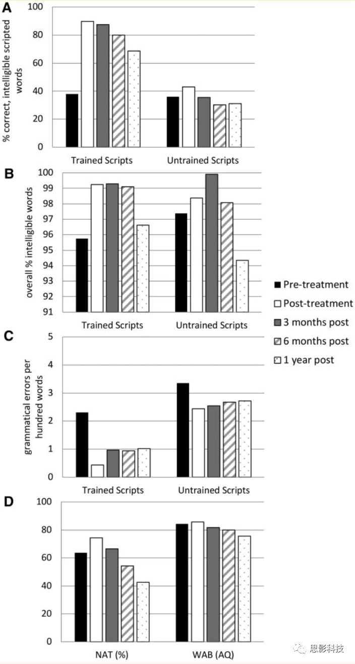 因此,來自德克薩斯州立大學的研究者,研究了10名失語癥患者接受一系列視頻康復程序的即時和長期益處。治療方法包括與臨床醫(yī)生通過結(jié)構(gòu)化治療反復改變康復程序,以及使用語音夾帶的視聽模型強化家庭實踐。作者評估了視頻程序制作的準確性,以及受過訓練和未經(jīng)訓練的視頻程序的整體可懂度和語法性。這些措施和標準化測試分數(shù)是在治療后和3個月、6個月和12個月隨訪時收集的。經(jīng)過訓練后,被試在經(jīng)歷過的主題上,所產(chǎn)生的正確、可理解的語言表述方面有了顯著的提高,在產(chǎn)出訓練過的主題時語法錯誤減少了,并且經(jīng)過訓練的主題和未經(jīng)訓練的主題在被試經(jīng)歷了康復程序的訓練后,整體可理解性都有了提高。在后來的測試中,作者發(fā)現(xiàn)了在經(jīng)過視頻康復程序訓練后的被試的治療效果在一些基本的測試項目中保持了一年以上的長期益處。