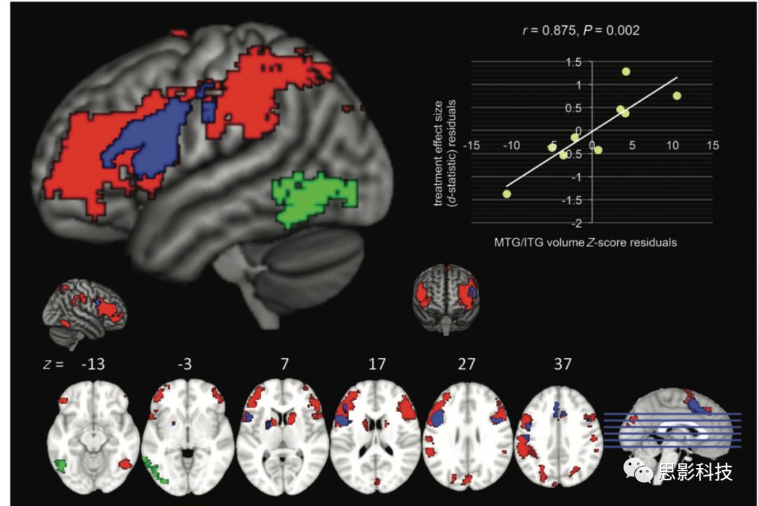 對處于這個網(wǎng)絡的11個種子點的分析發(fā)現(xiàn),僅在左側(cè)顳中下回的感興趣區(qū)域顯示出平均灰質(zhì)體積和治療效應顯著的偏相關(guān)(控制失語癥的嚴重程度)(r = 0.875, P = 0.002)。
