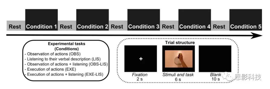 在任務(wù)開始時(shí),會(huì)給被試提供特定的指導(dǎo)語(yǔ),以提醒他們完成每個(gè)特定任務(wù)所要做的事情(例如,“觀察”,“執(zhí)行”,“聽”,“邊聽邊觀察”和“邊聽邊執(zhí)行”)。每一個(gè)block包含了22種日常動(dòng)作。因此實(shí)驗(yàn)的試次總數(shù)為110,實(shí)驗(yàn)刺激材料的呈現(xiàn)也是隨機(jī)的,以避免順序效應(yīng)偏差。