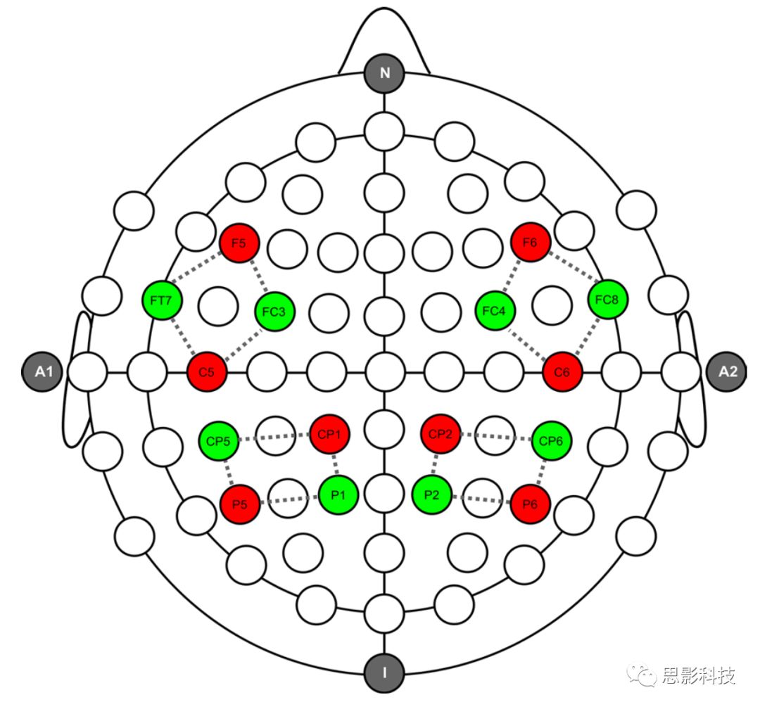 圖2 根據(jù)10-10國(guó)際標(biāo)準(zhǔn)的fNIRS光極排布圖